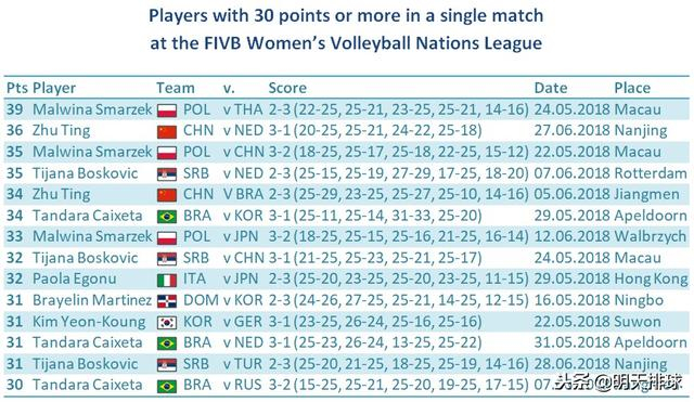 本年度女排国家联赛,共出现14次单场得分超过30分的情况。其中,波兰女排头号得分手斯马泽克三次上榜,她在澳门站面对泰国时轰下39分,创下女排国家联赛的单场得分纪录。此外,斯马泽克还在面对中国队和日本队时分别得到35分和33分,进攻火力惊人。