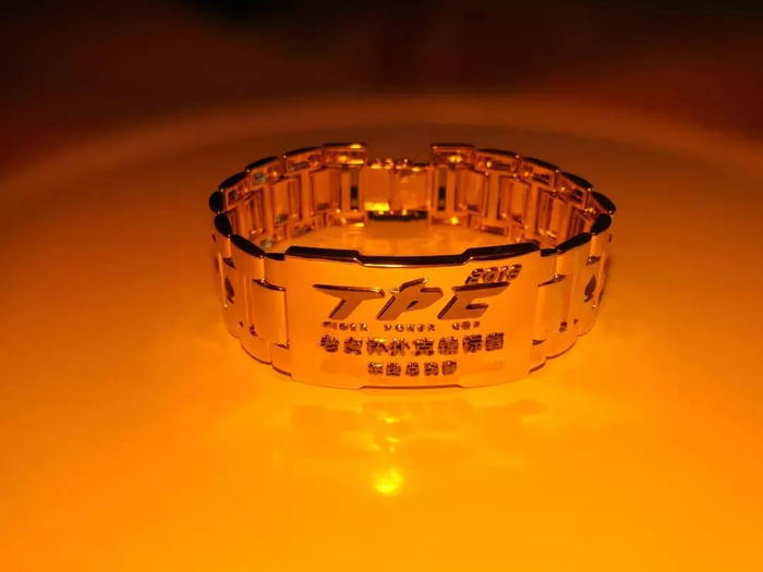 为了配合“如虎添翼”年终总决赛冠军奖杯,老虎杯还定制设计了一款只有总决赛冠军才能拥有的金手链,金手链为14K金材质,除了老虎杯LOGO,两侧各有代表扑克的黑红梅方形状,整条手链宛如一只精美绝伦的艺术品,其寓意为老虎杯的王中之王。