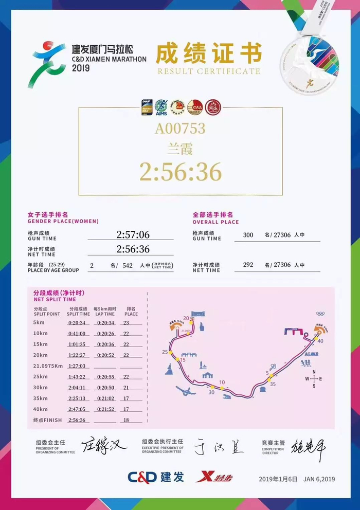 2019年1月6日的厦门马拉松,兰霞第二次参加厦马,再次实现突破,人生首次跑进3小时,成绩是2小时56分36秒,将个人PB提高了8分钟。