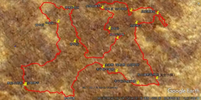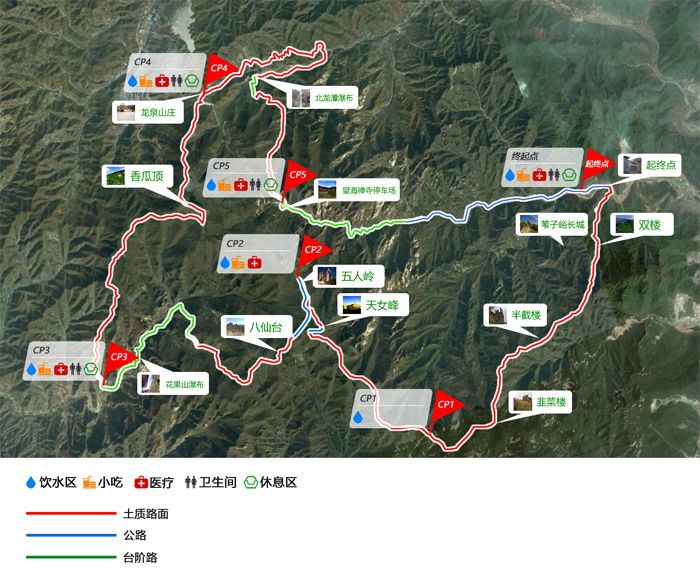 具体线路:起点天女小镇-画家村-双楼-韭菜地-韭菜地西山脊(CP1)-广河瀑布-方家河(CP2)-宝峰禅寺-龙潭-大石窟村-大石窟北沟沟口(CP3)-长城隘口-峪门口村-梁家湾村-冰塘峪景区(CP4)-背牛顶东垭口(CP5)-天女峰(1428米)-五人岭(CP6)-拔仙台(1391.3米)-花果山村(CP7)-香瓜顶(1370.1米)-龙潭山庄(CP8)-北龙潭瀑布-望海禅寺(CP9)-画廊谷-天女小镇(终点)