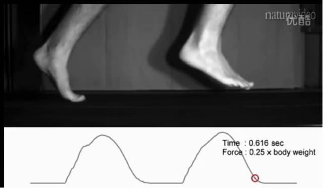 这样的情况下,接触点并未承受全部的冲击力,重力由竖立向下转化为滚动向前。这就是为什么前脚掌落地会比脚跟落地所承受的冲击力小得多。