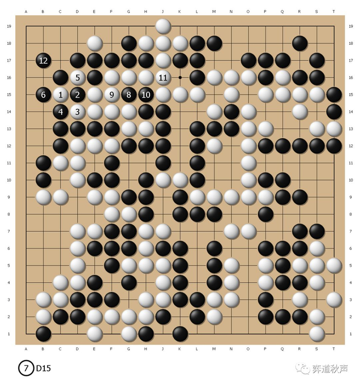 因为左下角黑棋被吃,白取胜已无悬念。但胜负神经绷得过紧的朱业明并未简明收束,而是落下了白1靠,意图再便宜点官子。俞巍巍黑2挖、4打好手,朱业明显然未意识到危机的存在,下出了白7粘的败招,黑8、10先手破眼,然后回到12位虎补,定睛一看,白棋蜿蜒大半个棋盘的巨龙竟然没有两眼!朱业明霎时流下满头冷汗……