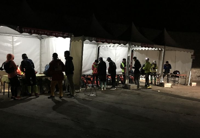 随着夜幕的降临,选手们陆续来到起点,取号码,存物品,做热身,气氛中带着兴奋。深夜,选手们在大山中前行,张晶和同伴们谁也没有合眼,仍然在存包处看守着选手们的衣物,志愿者马姐的一杯热水,让接近零度的深夜不再那么寒冷。