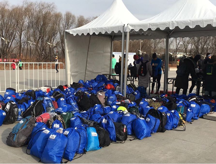 选手们陆续过来存包,存包时张晶不断嘱咐选手不要忘了带上手套、帽子,注意比赛中的防寒保暖,然后将包按照号码分区有序的摆好,跟他们说一句:加油,祝顺利完赛。这些叮咛温暖着每一位选手。