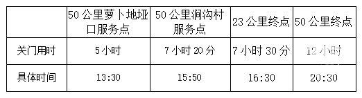 注:以上表格为参赛选手在各服务点关门时间。10公里3.5小时关门。违反关门时间规定当即取消比赛资格,一切不利后果自负。