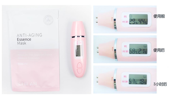 面膜使用肤感好不好,用起来水水润润就能明了,我们用专业的肌肤水油平衡测试仪对保湿度进行了测试,数据变化显著: