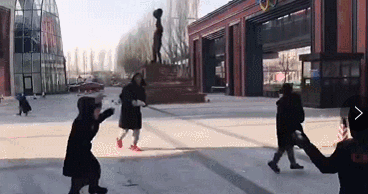 冰球馆外打雪仗的孩子们