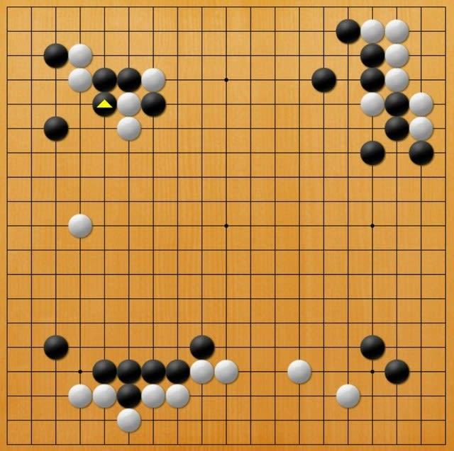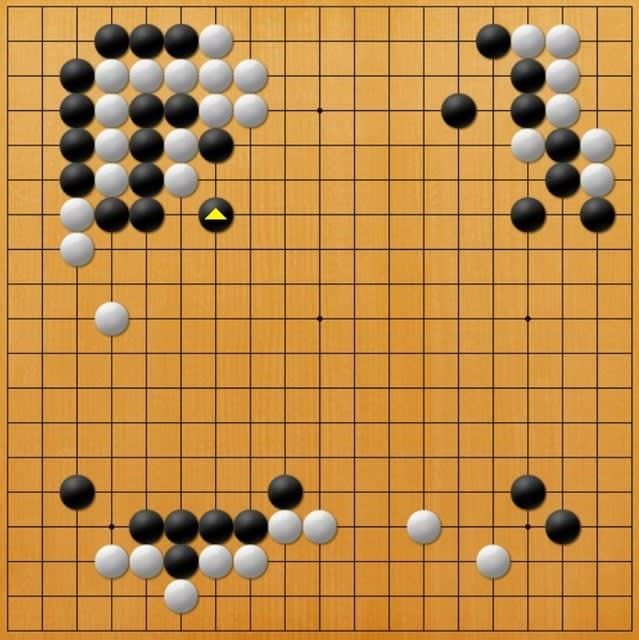 左上角下至黑△,白棋棋形不佳,两边都可能受到攻击,黑棋这个局部得分不少。