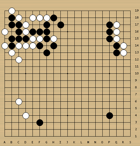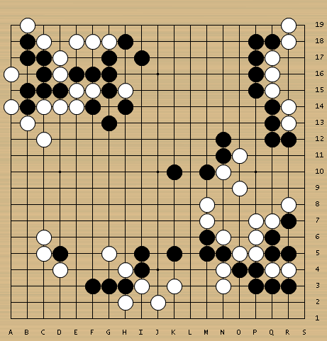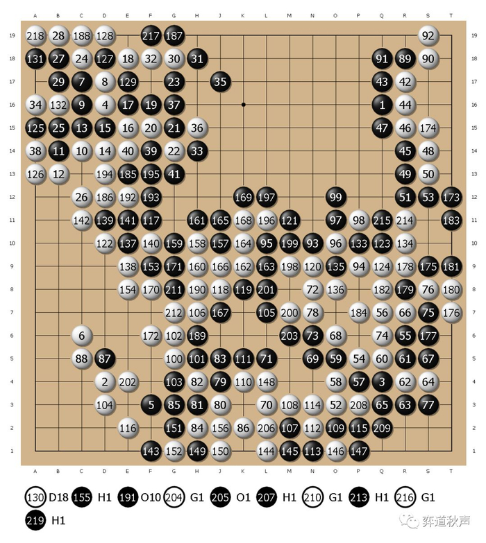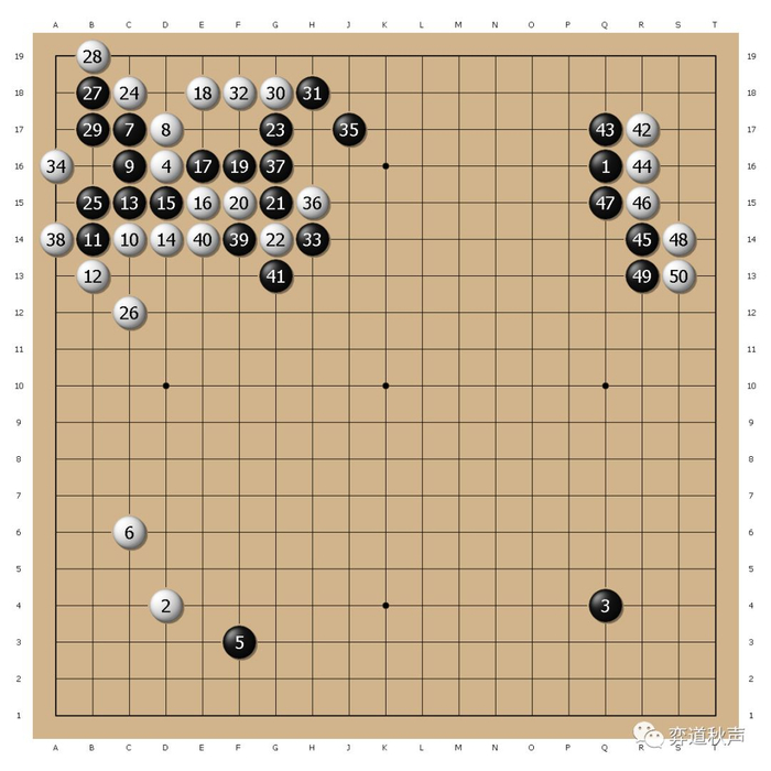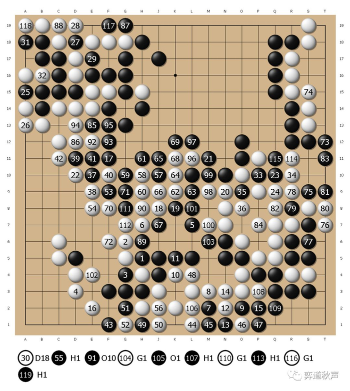 这个局部变化极为繁复,老萧实在是搞不清楚,无法细讲。好在两人实战的下法有迹可循,到黑41拔花告一段落,局部大致相当,但从全局配合看,黑棋更为满意。