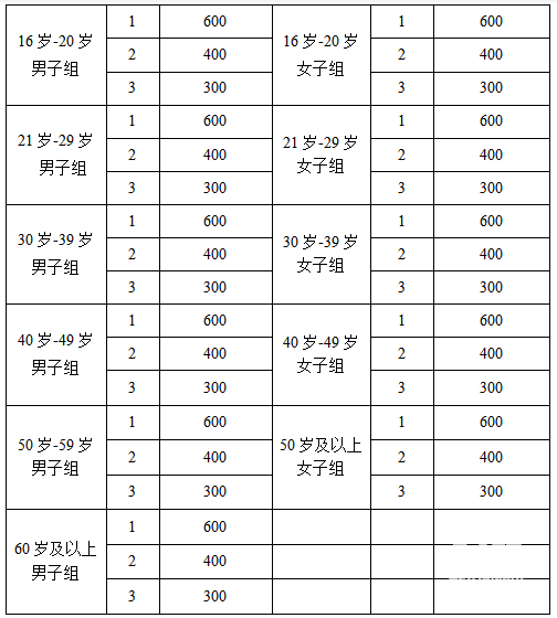 赛事还专门为不同年龄组的男、女子前三名都设置了年龄组奖金,从16-20岁组到60岁以上组的前三名选手都可以凭借有效成绩拿到奖金!