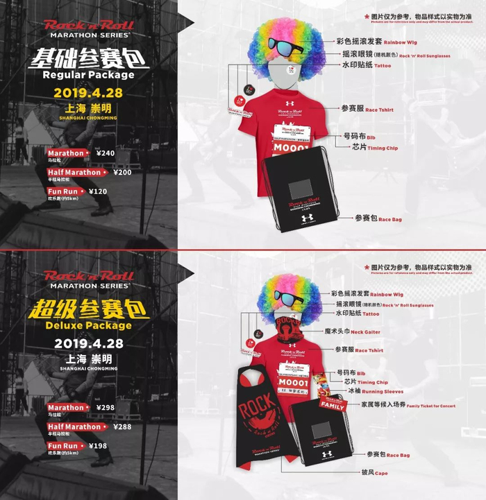 基础参赛包中除了赛事号码布、计时芯片、参赛服和参赛包之外,还为选手量身定制了彩色摇滚发套、摇滚眼镜,让所有跑者充分融入摇滚马拉松的狂欢气氛中;