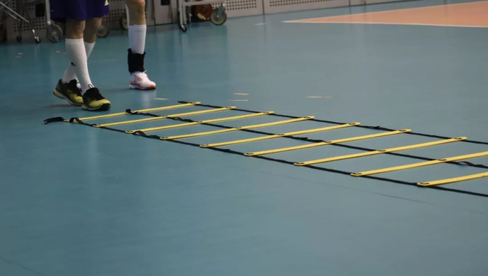 包导带着队员们热身,大家以软梯为道具,练习步伐移动。