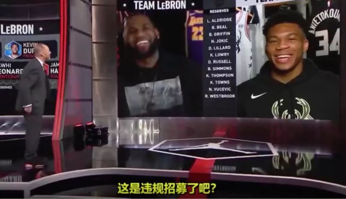 2月8日,詹姆斯和字母哥在转播镜头下做出各自决定,并互相玩梗,调侃。当詹姆斯选择了浓眉哥安东尼·戴维斯后,字母哥还不忘调侃他:“这是违规招募吧?”詹姆斯则笑着回答:“违规招募在全明星期间不存在的。”此外,双方还完成了一桩别样的交易,詹姆斯送出阵中的维斯布鲁克,从字母哥手中换来同经纪公司的小兄弟本·西蒙斯。