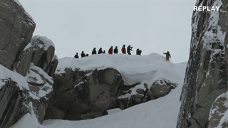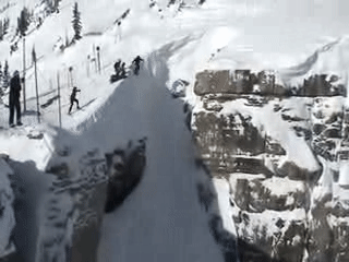 其次,这条雪道并不是“滑”下去,而是先要从近似悬崖的起跳点下落10-20英尺才能落在狭窄的“漏斗”中,稍不留神就会上演现实版“翻滚吧!人类”。这也就能理解为什么如此多极富经验的高水平滑雪者也很难在这里“站着”滑完全程;