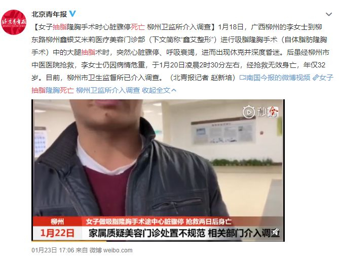 去年就有报道,一名大陆女子在台湾某医疗美容诊所进行抽脂手术时,突然失去呼吸心跳,被送医急救后仍然宣告不治。即使不抽脂减肥,抽脂还是有风险的。此前柳州一女子在做抽脂隆胸手术时,心脏骤停死亡!
