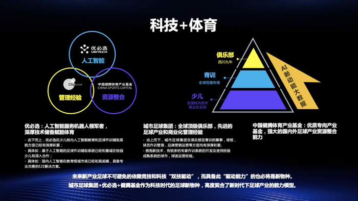 金字塔模型逐级支撑、持续造血,科技成分引领发展、进行驱动,优必选科技+城市足球集团+健腾基金将作为科技时代的足球新物种,将在新时代下的足球产业趟出一条没有人走过的路。