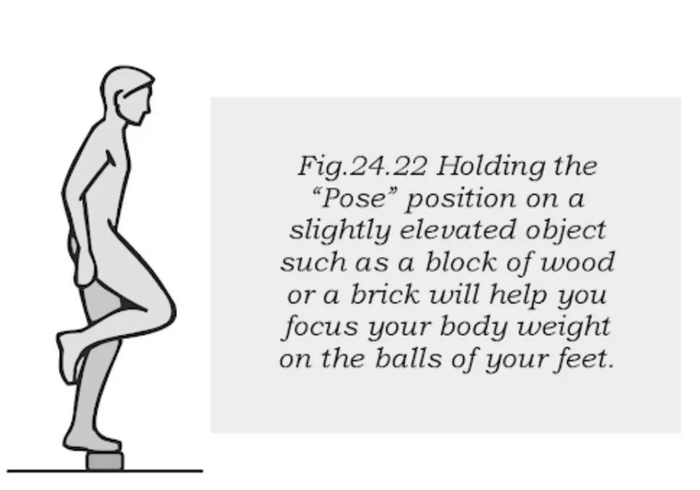 在前脚掌下垫一块砖头,赤脚站在上面并维持关键跑姿,同时要保持身体平衡。