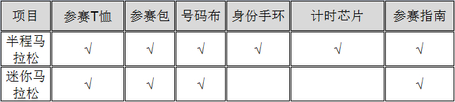 (五)半程马拉松项目男、女前三名选手现场分别颁发奖杯和奖牌,并发放领奖服一件;在关门时间内完赛者,凭本人有效号码布和身份手环可领取完赛物品和完赛纪念奖牌。