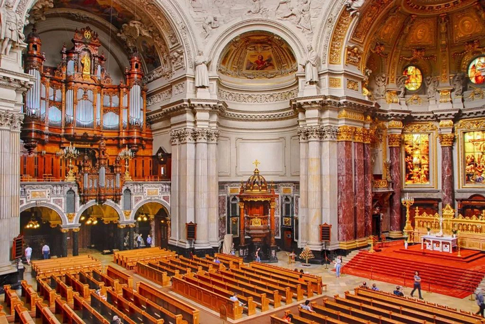 与那些外表华丽内饰简朴的哥特式教堂不同,柏林大教堂的内饰极其华丽甚至达到了浮华的程度,与阴森冷峻的外表成为鲜明对比。