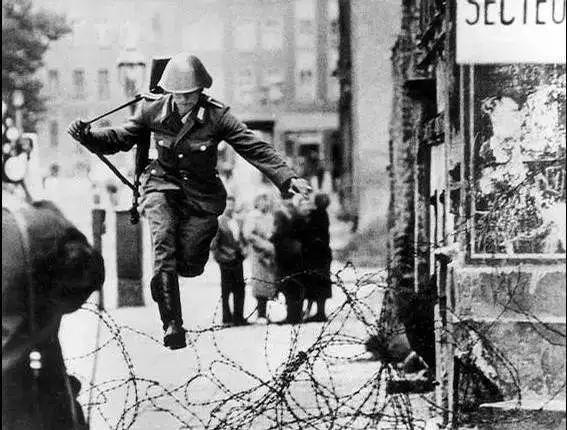 1961年8月,柏林墙还还只是铁丝网搭起的雏形。负责守卫边界的19岁东德士兵汉斯•康拉德•舒曼突然甩掉步枪大步跃过铁丝网奔向了西柏林。这个瞬间被摄影师拍下,成为冷战时期的最经典照片之一。