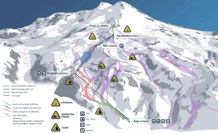 作为战斗民族的老牌滑雪圣地,在厄尔布鲁士广袤的雪坡上,雪道总长度超过15公里!每年五月是厄峰滑雪最好的季节。