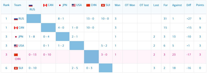 此次中国女冰在连续大比分输给了加拿大女冰和东道主俄罗斯队后,今天3:0轻取瑞士,获得首胜,暂时排名小组第5