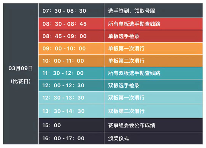 (5)比赛报到:参赛运动员须早上8:00到达比赛现场雪具大厅一层签到处进行检录并领取参赛号码衫。未按照规定时间进行报到检录者,按无故弃权处理,取消比赛资格。