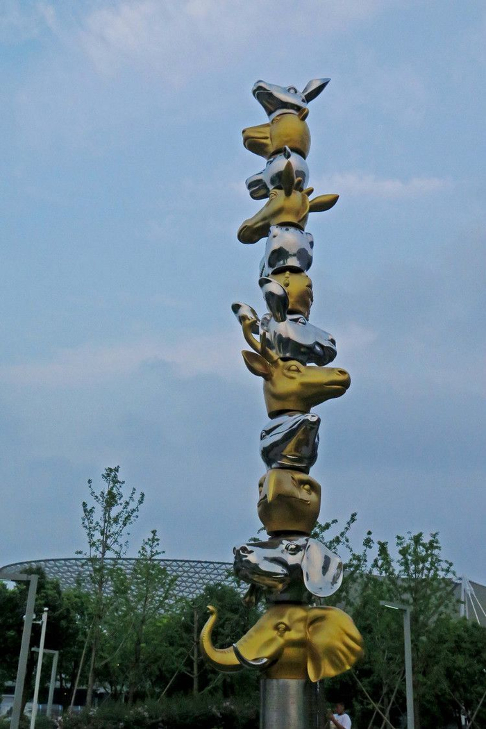 这是青年雕塑家陈长伟的作品,十二个动物头像从上到下依次是:袋鼠、熊、豹、长颈鹿、恐龙、鳄鱼、斑马、梅花鹿、海豚、白头鹰、斑点狗、非洲象,雕塑在与传统十二生肖中重新对应表达了一种睿智和诙谐。文:走近上海yuchen