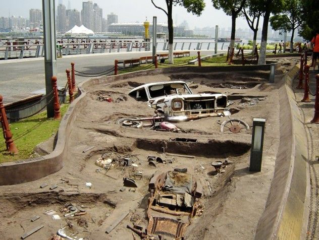 这件作品以“考古现场”的形式展现人们在不同时期使用的老物件,叙述上海这座城市“让生活更美好”的岁月历程,通过艺术手法诠释出世博会的主题。“挖掘”出的文物有我们熟悉的上海牌轿车、幸福摩托、马桶和搪瓷脸盆。