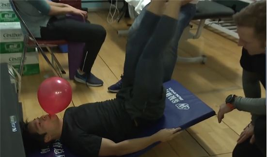 而如果更多让腹肌用上力量,吹气球就会比较轻松,这也就是苏炳添训练吹气球甚至在做力量训练动作时一边做一边吹气球的原因了——主要是训练腹式呼吸能力,同时也能增加胸式呼吸的力度。