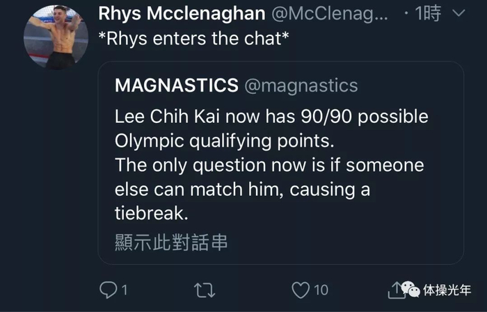 不过,最终结局还未一锤定音,各路鞍马高手还是有机会的,比如这几站因伤没有参赛的爱尔兰鞍马名将Rhys,就在推特上po文,有意与李智凯一争高下。