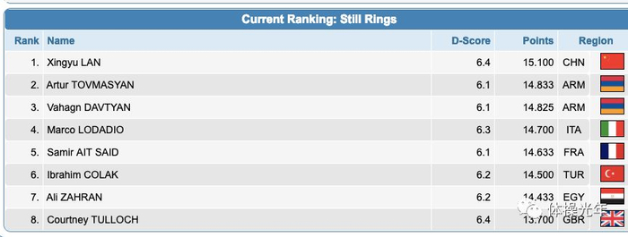 男子吊环决赛,中国选手兰星宇凭借难度和完成优势轻松夺冠。在刘洋没有参赛的情况下,也顺利让30分的奥运积分没有旁落他国。