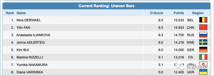 女子高低杠决赛,范忆琳将难度加到6.5,但因为并掏360的角度,E转有点歪等小问题损失了一些完成分,最后以不到0.1分之差惜败比利时名将妮娜收获亚军,俄罗斯队的依恋以6.3的难度排名第三。这次比赛范范的状态明显比墨尔本的时候好了不少,也证明了受伤恢复后hold住6.5成套是完全没问题的,相信后面比赛会越来越棒的。