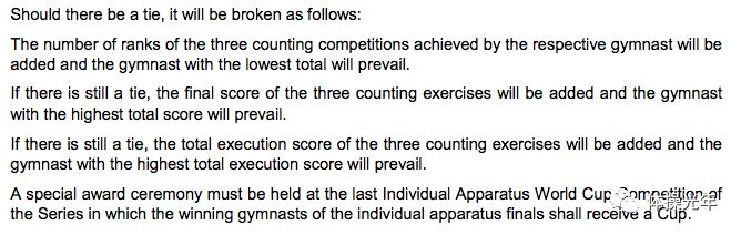 简单的说,如果1个项目上2位选手都拿到三站冠军,积分90分,那么首先看谁这3站实际得分总和(D+E)更高;若相同,看谁的3站E分总和高;若还一样,看谁的3站D分总和高。