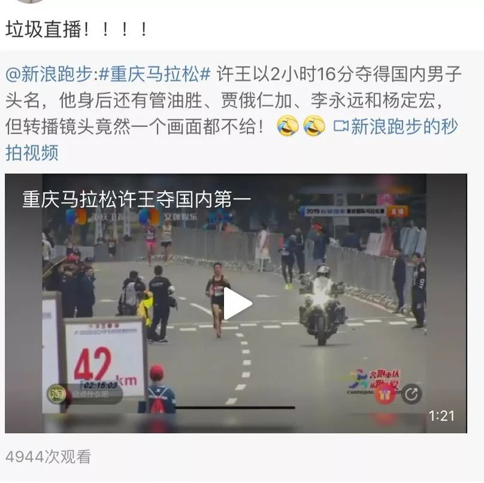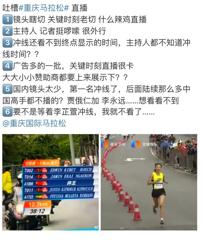 不过,相比精彩的赛事。本次重庆马拉松的直播解说和镜头却被广大跑友集体吐槽。👇