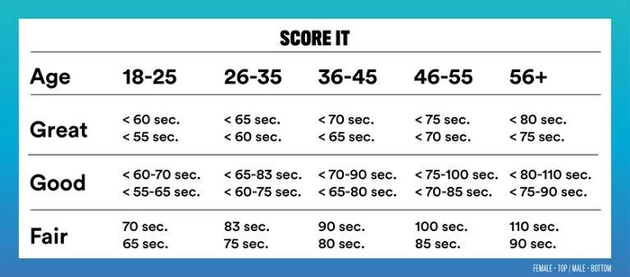 男性18-25岁,55秒以内是优秀;55-65秒是良好;65秒以上一般。