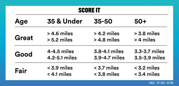 男性:35岁以下跑步距离超过8.36公里为优秀;6.76-8.35公里为良好;6.75公里以下为一般。