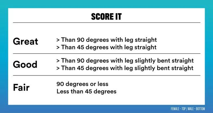 良好:女性腿微微弯曲可以做90度伸展,男性腿微微弯曲可以做45度以上伸展;