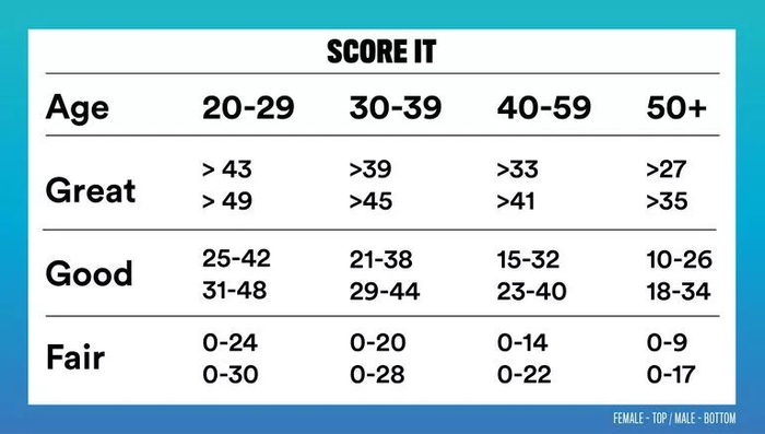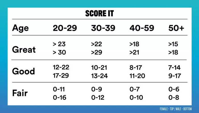 男性20-29岁,能做30个俯卧撑就很优秀;能做17-29个属于良好;只能做16个以下,体能一般。