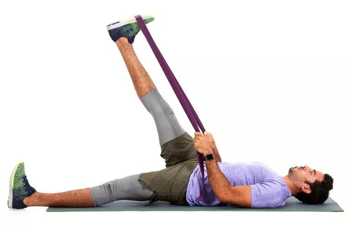 躺在瑜伽垫上,使用弹力带套在脚掌,伸直腿往胸前拉伸,注意腿不能弯曲。