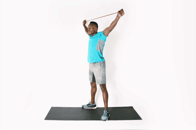 测试这个动作要用到的器械是弹力带。双手拉紧弹力带举过头顶,然后做深蹲。再重复两次。脚跟悬空,站在5厘米高的板上,再次测试。
