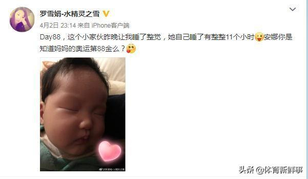 在4月2日晚上,游泳奥运冠军罗雪娟在个人社交平台晒出一张照片,并发表状态表示:“Day88,这个小家伙昨晚让我睡了整觉,她自己睡了有整整11个小时,安娜你是知道妈妈的奥运第88金么?”