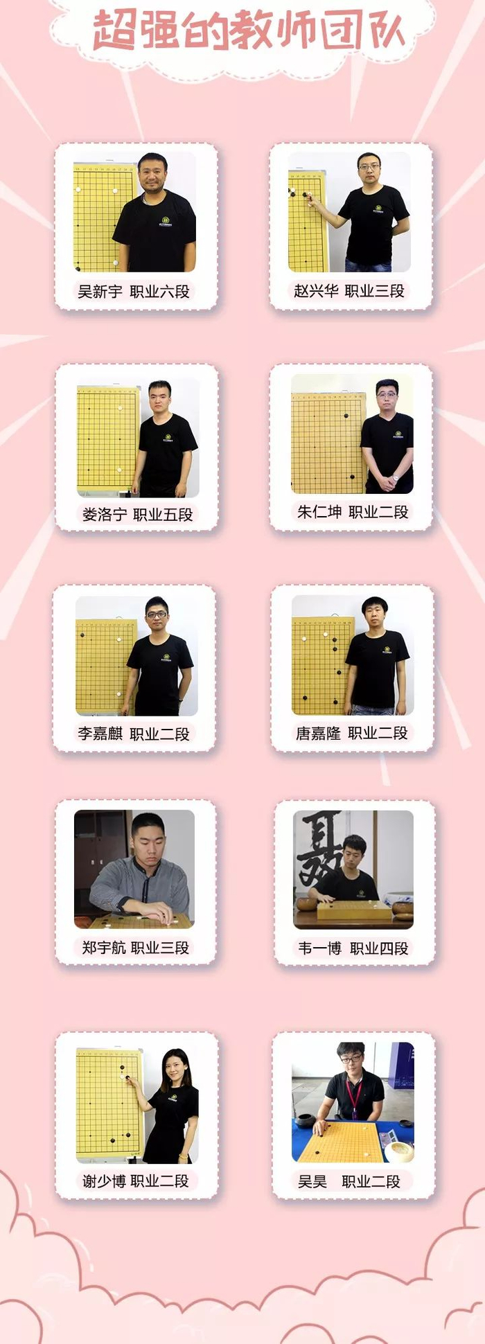 吴新宇职业六段 李康职业六段 娄洛宁职业五段 韦一博职业四段 郑宇航职业三段 朱仁坤职业二段 李嘉麒职业二段 唐嘉隆职业二段 黄一鸣职业二段 吴昊职业二段