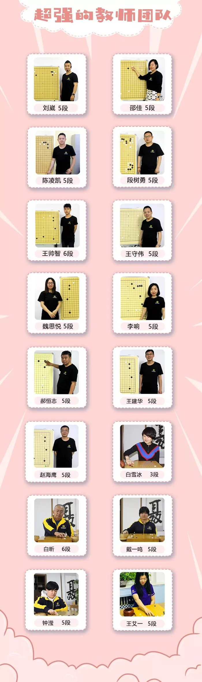 刘崴5段 王帅智6段 王守伟5段 段树勇5段 邵佳5段 李响5段 赵海鹰5段 郝恒志5段 王建华5段 钟滢5段