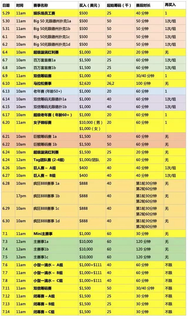 巨人赛将于6月26/27日开赛,这也将成为WSOP历史上买入最低的赛事,此前买入$565 ,今年降低了$165。选手起始筹码40,000,整场赛事赛段时长均为40分钟。6月28日进入第二轮,6月29日产生决胜桌。