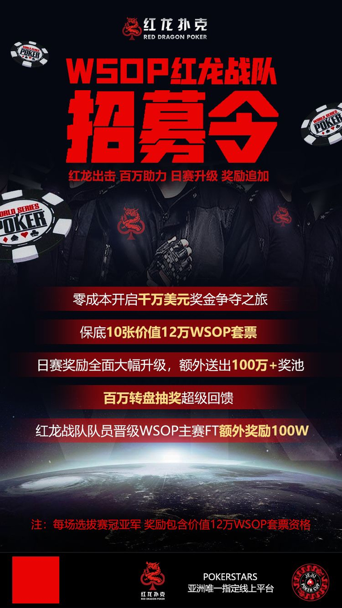 鉴于WSOP成本过高,让很多优秀玩家无法参与到WSOP这项全球顶尖扑克赛事中,特此红龙扑克为大家提供了免费参与WSOP的机会!4.2-5.11号百万福利等你来!
