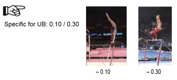 -高低杠和平衡木下法近杠扣0.3。COP对于落地扣分有上限0.8的规定,但近杠的扣分不受这个限制,因为近杠不算是落地扣分的一类。