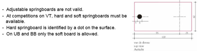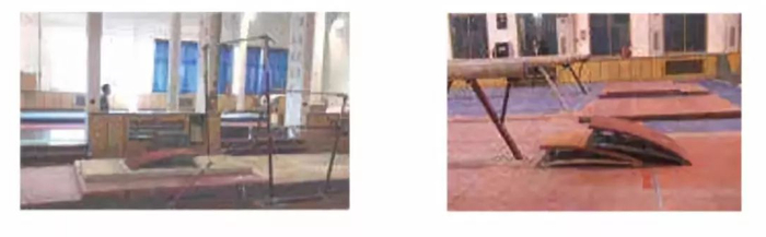 △可调节的踏板是不被允许的;跳马比赛硬的和软的踏板都要准备好;硬的踏板表面有一个圆点用于区分;平衡木和高低杠只能用软的踏板。