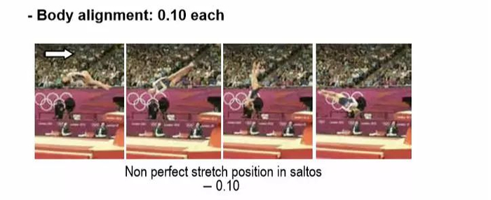 -在单个空翻中团身或屈体姿势不精确,扣0.1或0.3,但两周空翻和带纵轴转体的空翻,对团身或屈体姿势不会扣不精确分。