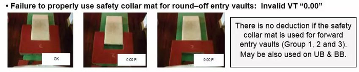 -踺子小翻上板动作未合理使用安全垫圈,该跳计为0分;1、2和3组的跳马动作可以使用垫圈,不会扣分。高低杠平衡木如果需要也可以使用。